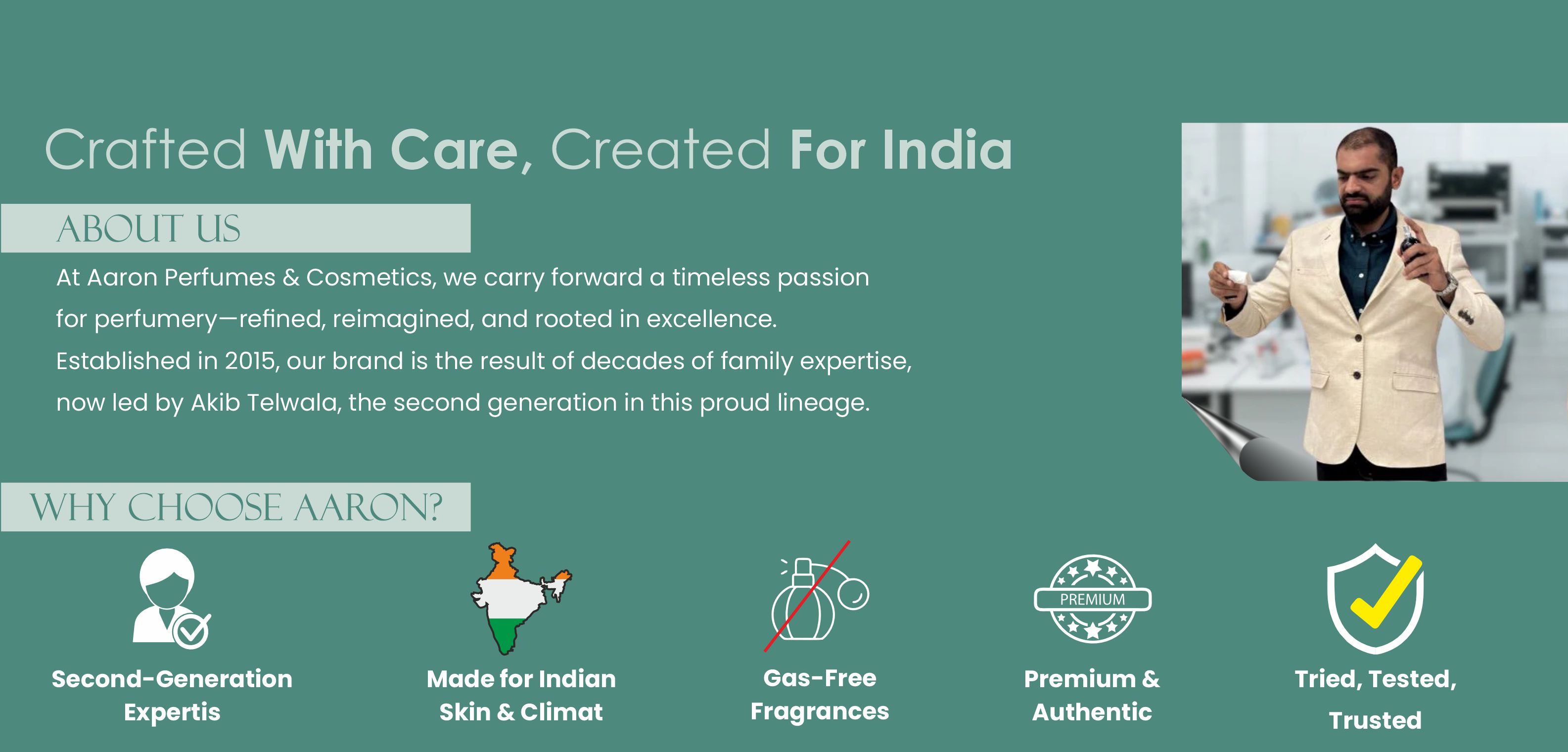 At AARON, we blend timeless tradition with modern sophistication. Every bottle is a masterpiece, crafted using the world's finest, ethically sourced ingredients to create lingering memories.